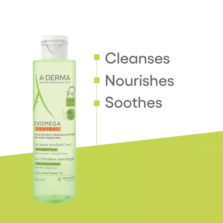 A-Derma Exomega Control 2-in-1 Cleansing Gel is a gentle cleanser designed for very dry, sensitive, and atopic-prone skin. It works as both a face and body wash, effectively cleansing while preserving the skin’s natural barrier and preventing dryness.