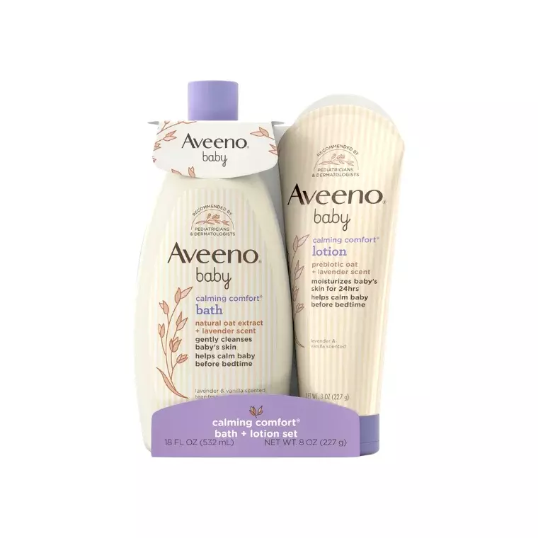 Aveeno Baby Calming Comfort Bath & Lotion Set is a soothing skincare duo designed to gently cleanse and moisturize delicate baby skin while promoting relaxation. Infused with natural oat extract and calming lavender & vanilla scents, it helps create a comforting bedtime routine.