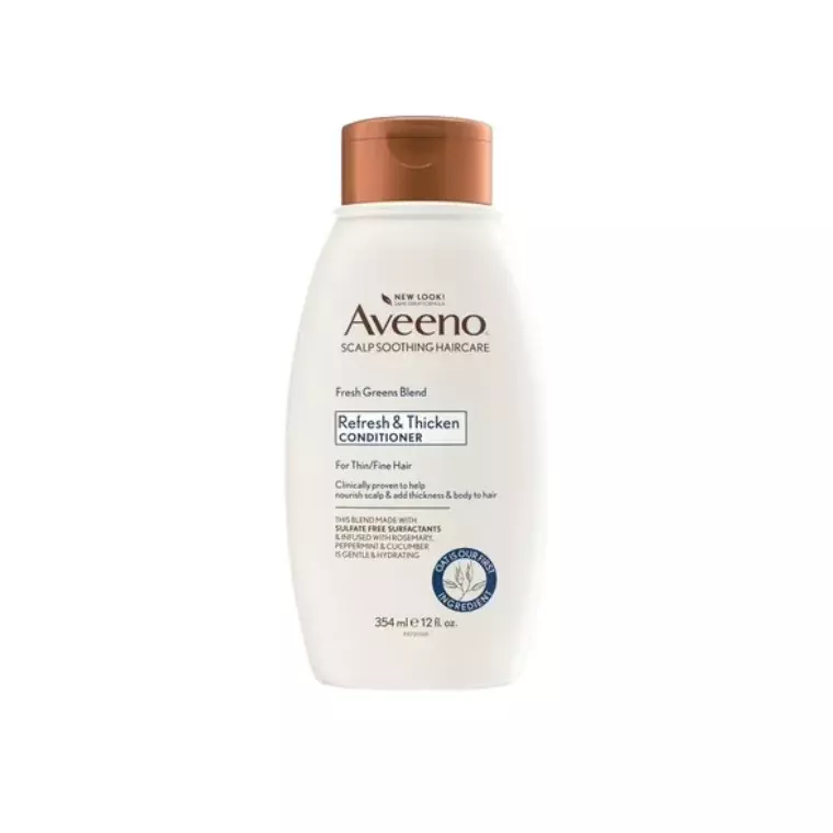 Aveeno Fresh Greens Blend Refresh & Thicken Conditioner is a lightweight nourishing conditioner designed to help refresh the scalp while improving the look of thicker, fuller hair. Infused with oat extract and a fresh greens blend, it helps balance the scalp and add softness without weighing hair down.
