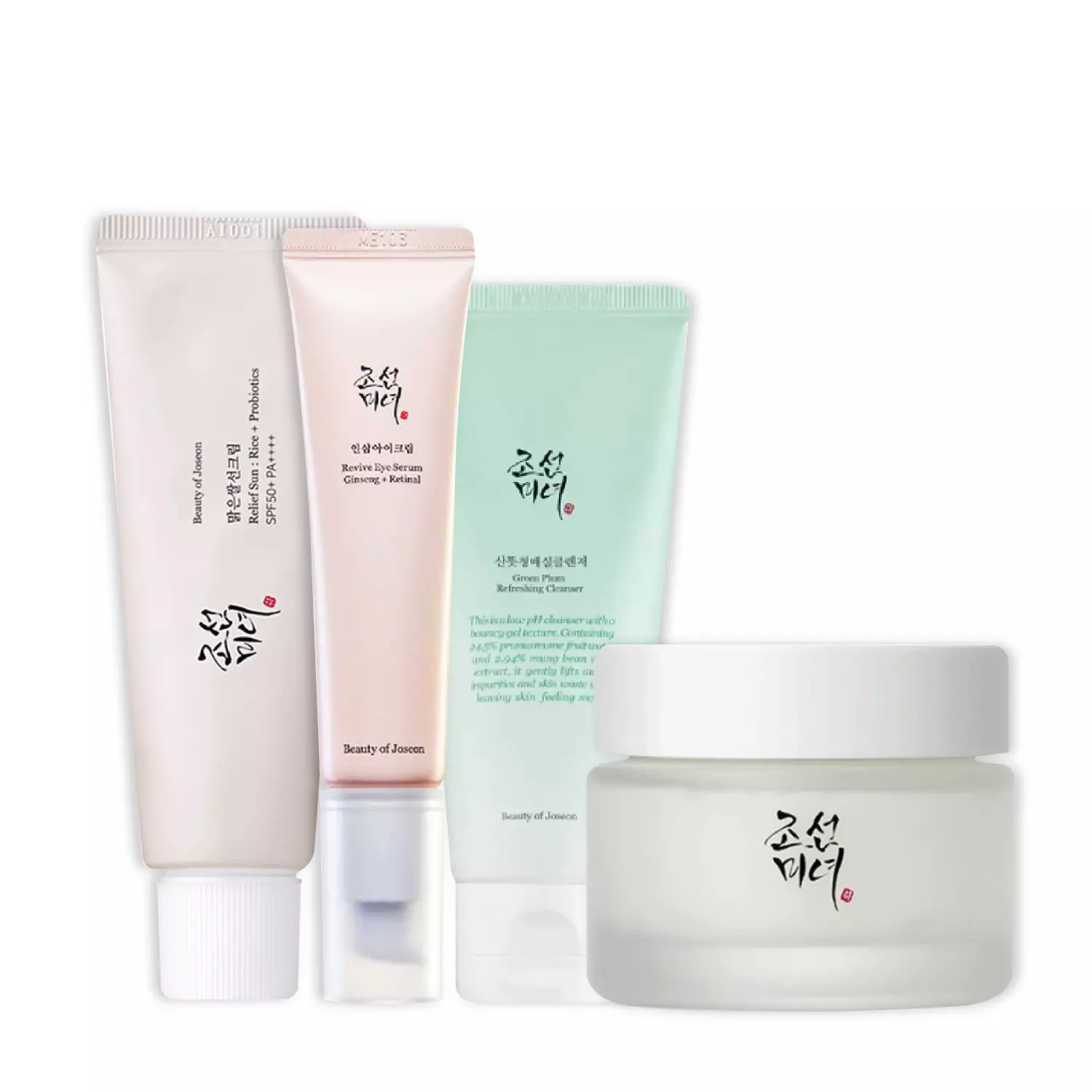 Beauty of Joseon 4 pcs Bundle Set [Relief Sun: Rice + Probiotics SPF50+ PA++++, Revive Eye Serum: Ginseng + Retinal, Green Plum Refreshing Cleanser, Dynasty Cream]