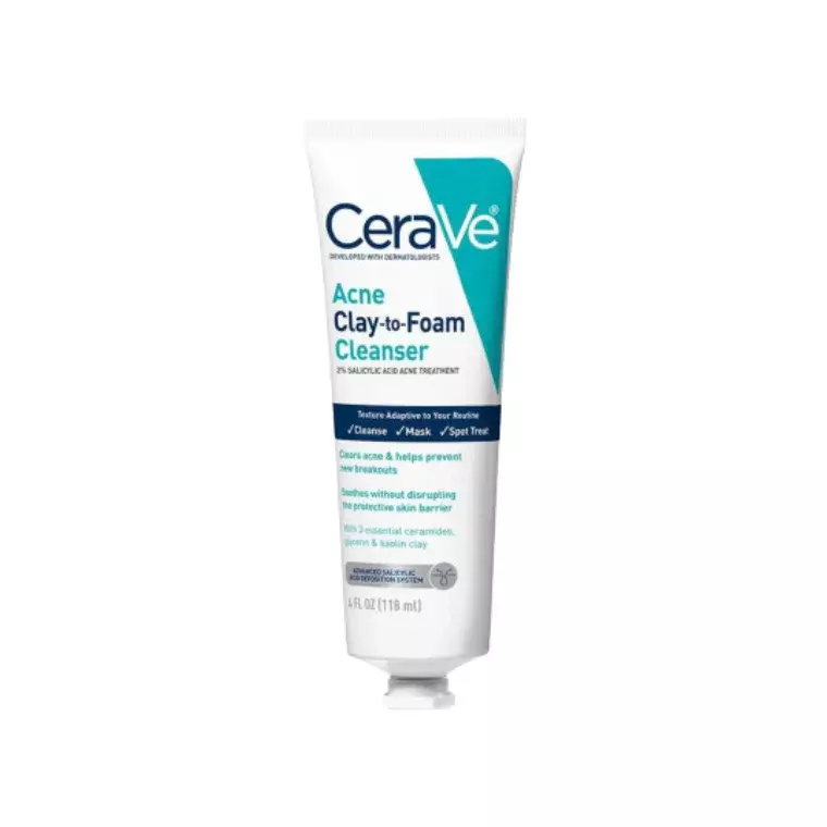 CeraVe Acne Clay-to-Foam Cleanser is a multi-action cleanser that starts as a clay and transforms into a gentle foam to deeply cleanse pores, absorb excess oil, and help reduce acne. It combines oil-absorbing clay with acne-fighting ingredients while maintaining the skin’s natural barrier.