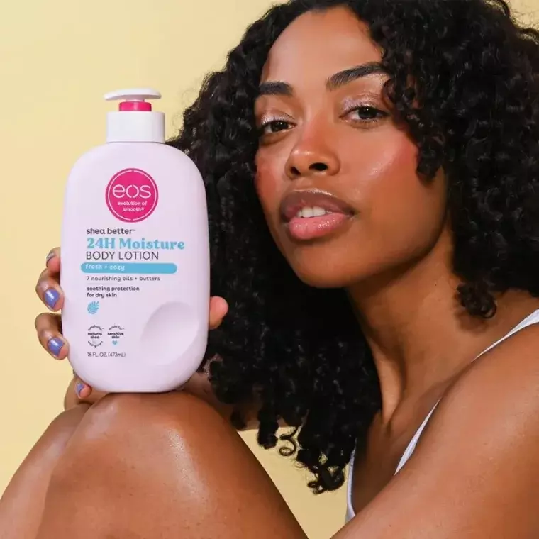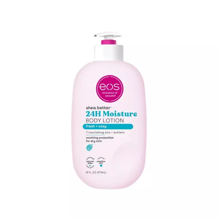 eos Shea Better 24H Moisture Body Lotion Fresh & Cozy is a deeply hydrating body lotion designed to keep skin soft, smooth, and moisturized for up to 24 hours. Enriched with shea butter and nourishing oils, it helps restore dry skin while leaving a warm, comforting fragrance.
