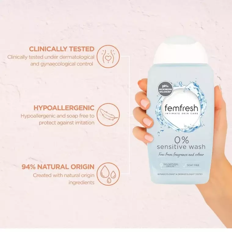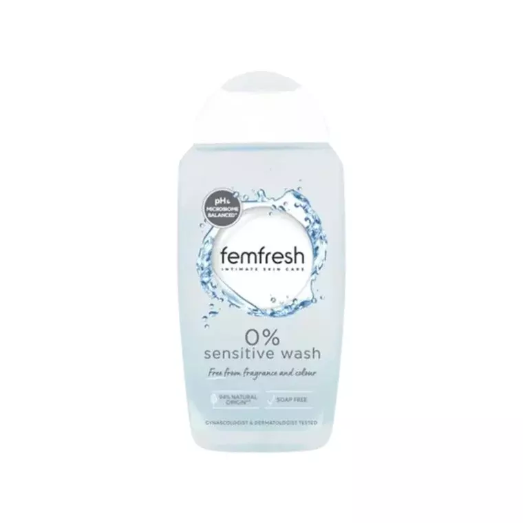 Femfresh 0% Sensitive Intimate Wash is an ultra-gentle cleanser specially formulated for intimate hygiene, ideal for sensitive skin. Its 0% formula (free from fragrance, color, and soap) helps maintain natural pH balance while providing a clean, fresh, and comfortable feeling.