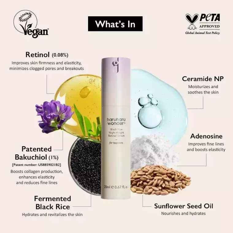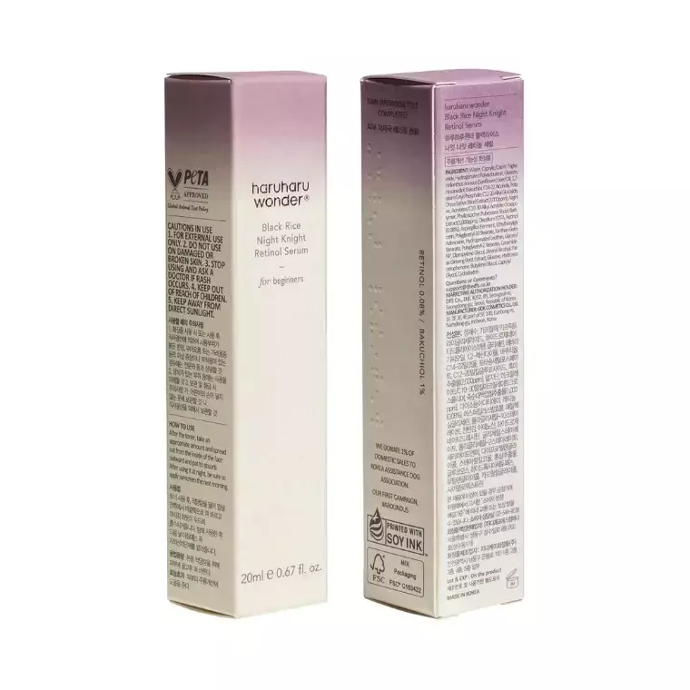 Haruharu Wonder Black Rice Night Knight Retinol Serum is a gentle yet powerful nighttime treatment designed to improve texture, firmness, and radiance. It features micro-encapsulated retinol (0.08%) along with bakuchiol for gentler cell renewal, plus black rice extract and ceramide NP to nourish and support the skin barrier.