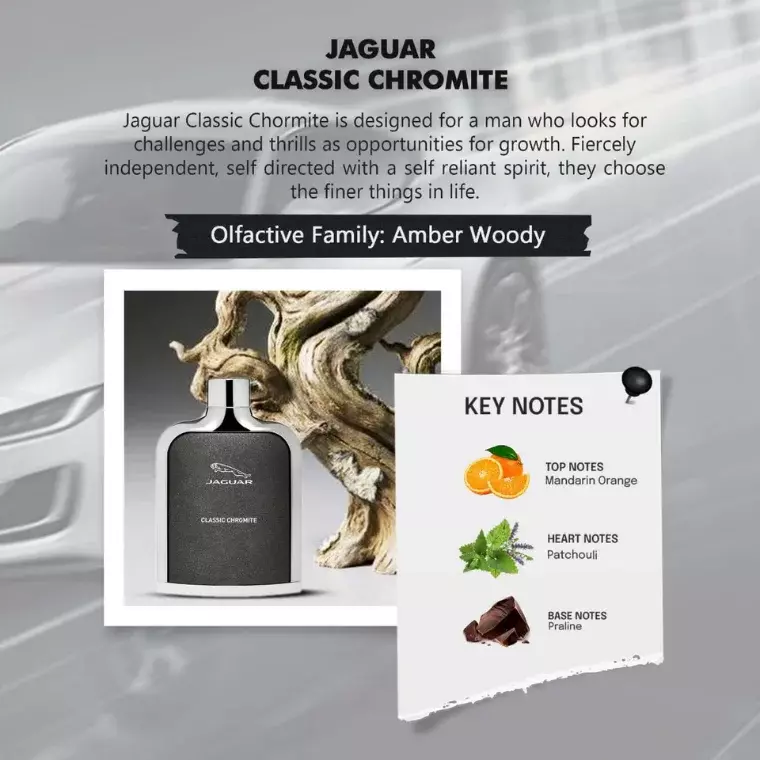 Jaguar Classic Chromite is a bold, modern men’s fragrance with a refined balance of fruity freshness, smoky warmth, and woody depth. Designed for confident and independent men, it delivers a powerful yet elegant scent suitable for both day and evening wear.