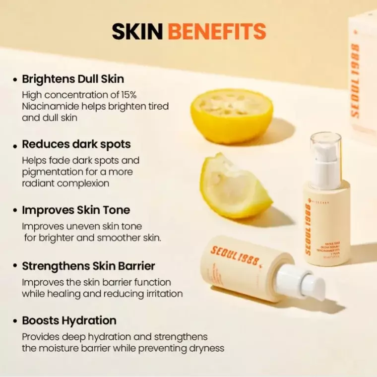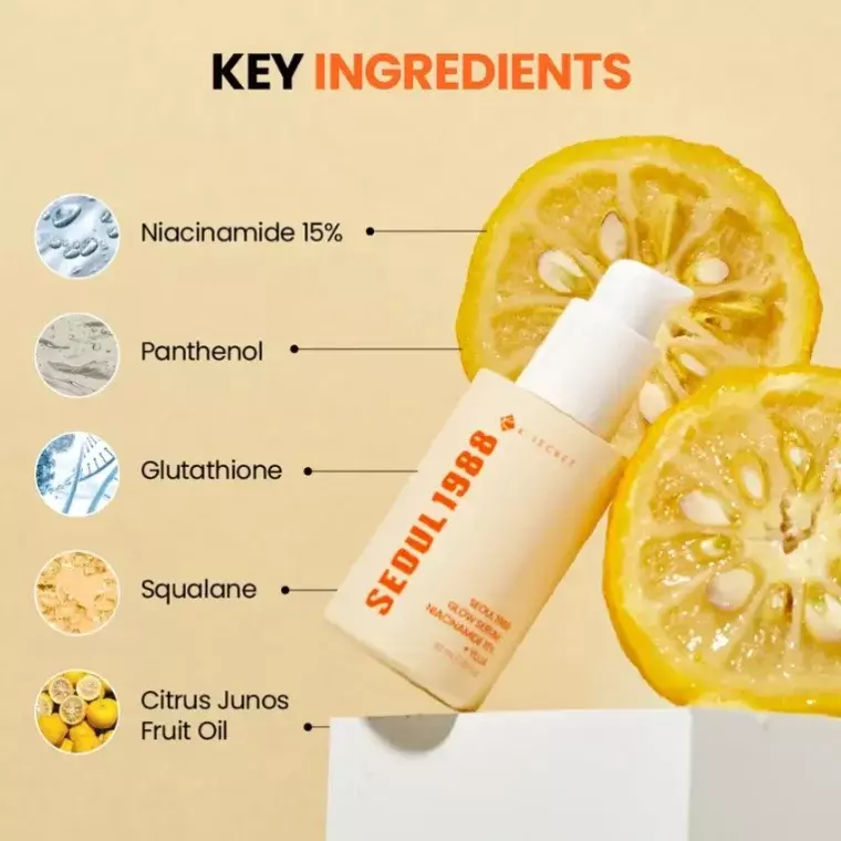 KSECRET SEOUL 1988 Glow Serum is a potent brightening and skin-tone enhancing serum formulated with 15% niacinamide and yuja (citron) extract to help improve dullness, even out complexion, and boost radiance. Its lightweight, fast-absorbing texture works to refine skin texture, fade dark spots, and support a clearer, more luminous look when used consistently.