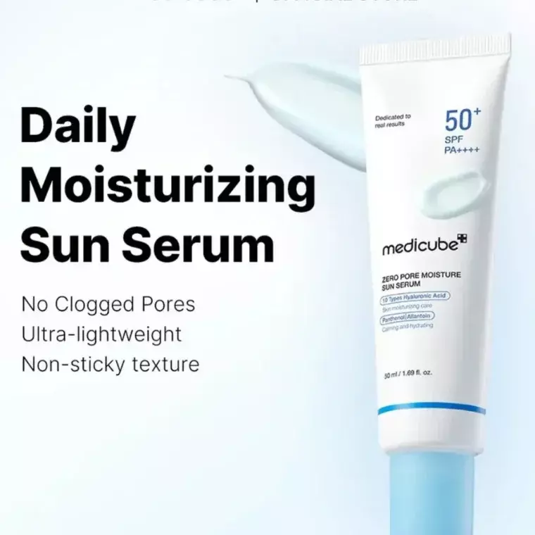 Medicube Zero Pore Moisture Sun Serum SPF50+ PA++++ is a high‑protection, lightweight sun serum designed to shield the skin from harmful UVA and UVB rays while delivering lasting hydration and pore‑refining benefits. This sunscreen blends broad‑spectrum sun protection with skincare properties to keep skin moisturized, smooth, and comfortable throughout the day.