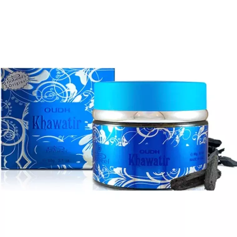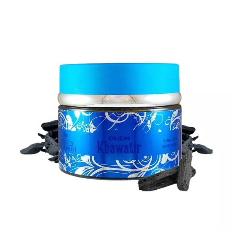 Nabeel Oudh Khawatir (60 gm) is a refined traditional Arabian incense crafted to perfume your surroundings with a rich, warm, and luxurious oriental aroma. Made from high-quality aromatic woods infused with premium fragrance oils, this bakhoor releases a deep and long-lasting scent that enhances the atmosphere of any home or special gathering.