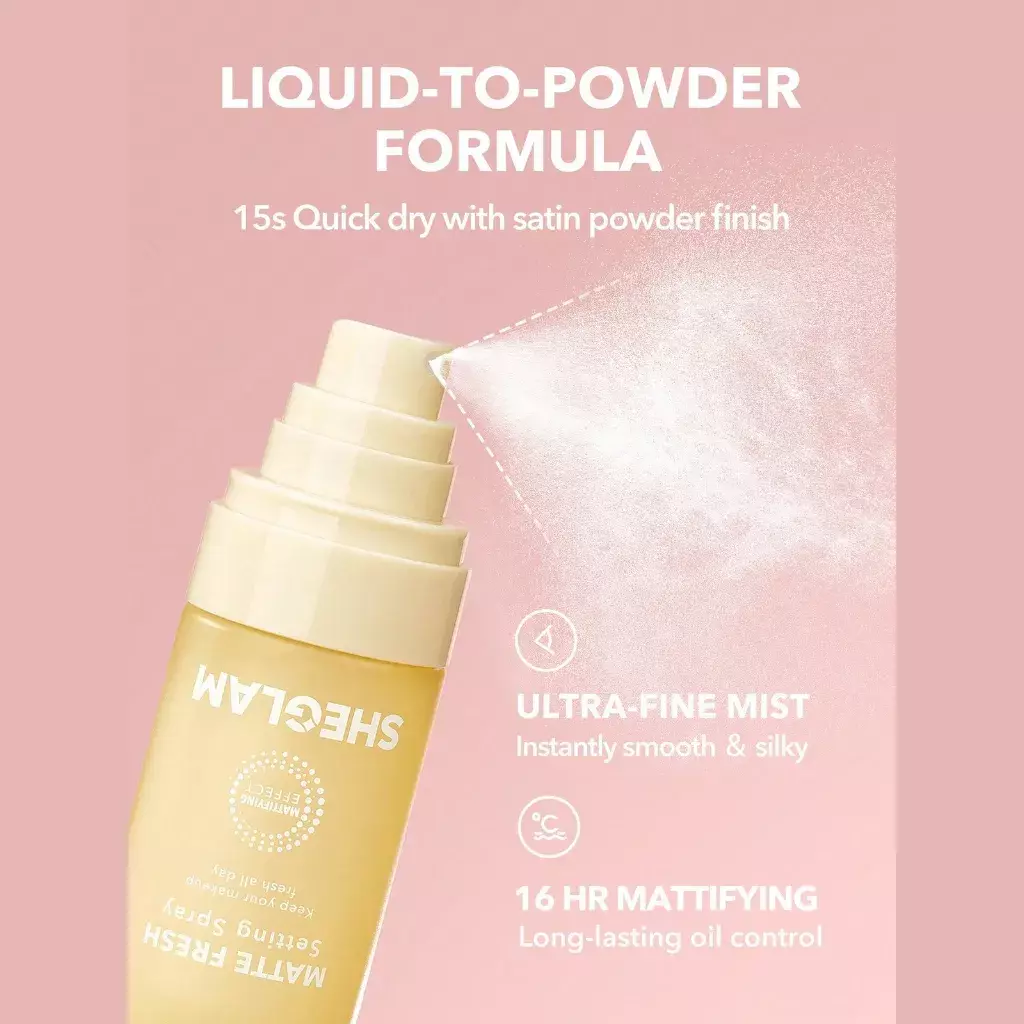 The Sheglam Matte Fresh Setting Spray is a lightweight mist designed to lock in makeup with a matte, shine‑free finish that lasts all day. Its refreshing formula helps control oil and minimize the look of pores while keeping your makeup from fading, smudging, or settling into fine lines. Perfect for normal to oily skin types or humid climates, this setting spray gives your look a fresh, velvety feel without heaviness. Whether you’re prepping for a long event or everyday wear, it keeps your makeup intact and looking flawless.