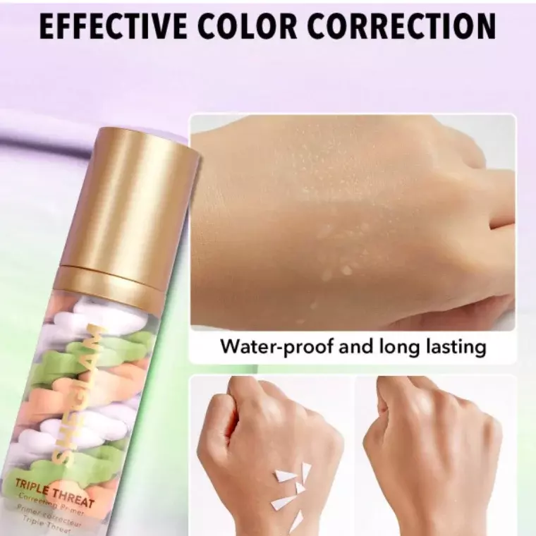 SHEGLAM Triple Threat Correcting Primer is a multi-color correcting face primer designed to neutralize redness, brighten dull areas, and smooth skin texture before makeup. It has a swirl of different tones that blend into the skin to create a more even base.
