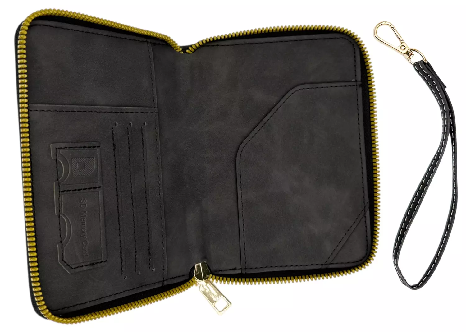 A smooth-gliding zip-around closure ensures everything stays neatly tucked in, while the detachable wristlet strap offers easy, hands-free convenience.